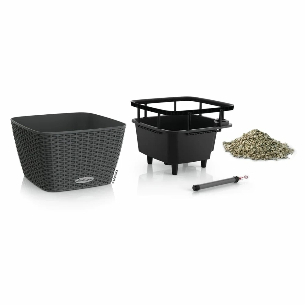 - l’ensemble tout-en-un comprend une jardinière, une doublure de jardinière amovible avec poignées, un indicateur de niveau d’eau et du substrat végétal